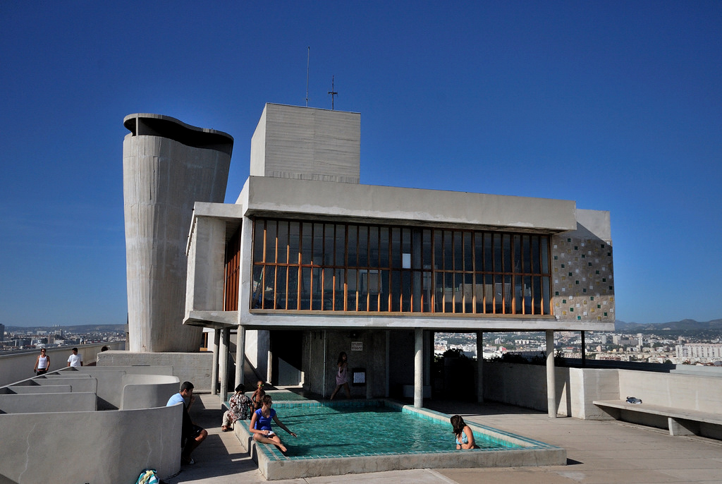 Image: la piscine sur le toit de l’Unité d’Habitation de Marseille (source image)