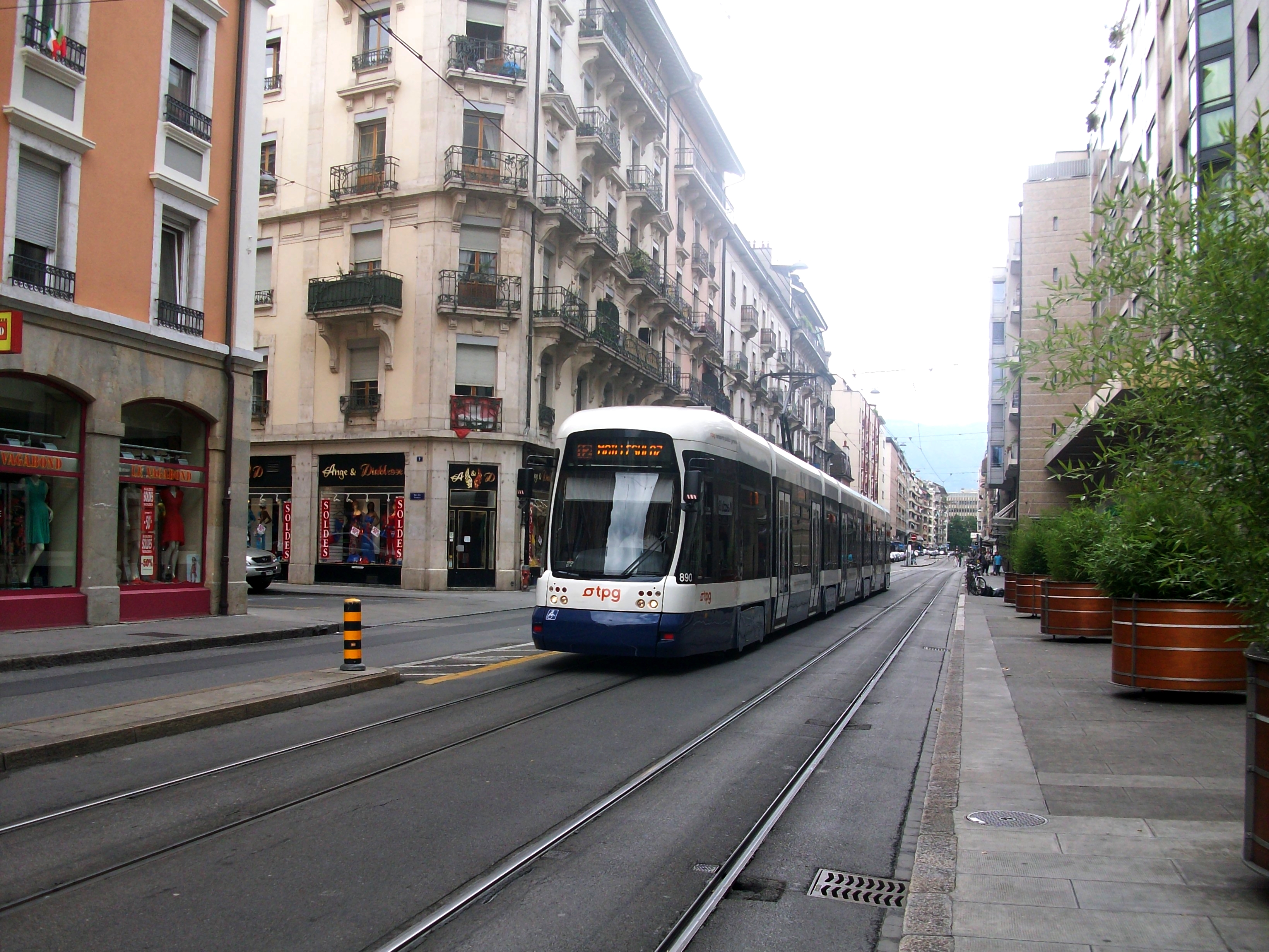 Genève, Rue de Carouge. Les habitants qui rentrent du travail arrivent en tram, font leurs courses dans la magasin au rez et montent à la maison à l’étage. Le parcours est le plus court possible. (image: wikipedia)