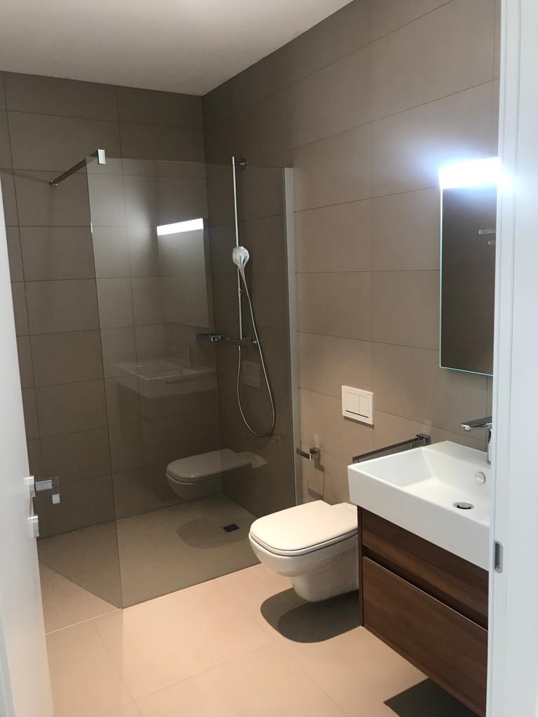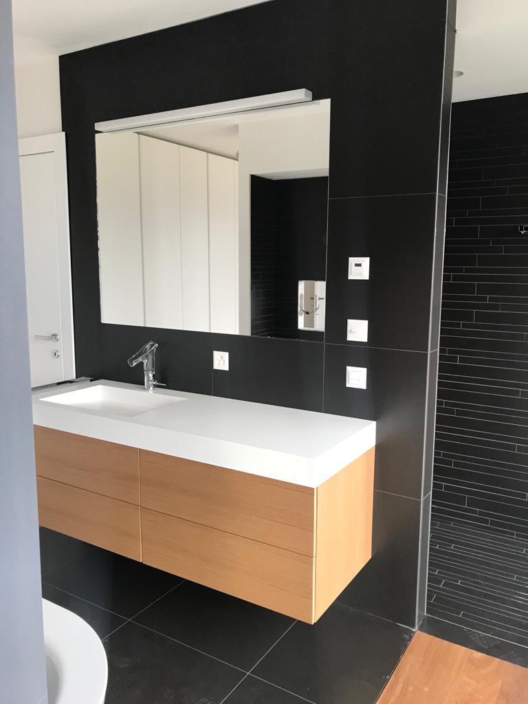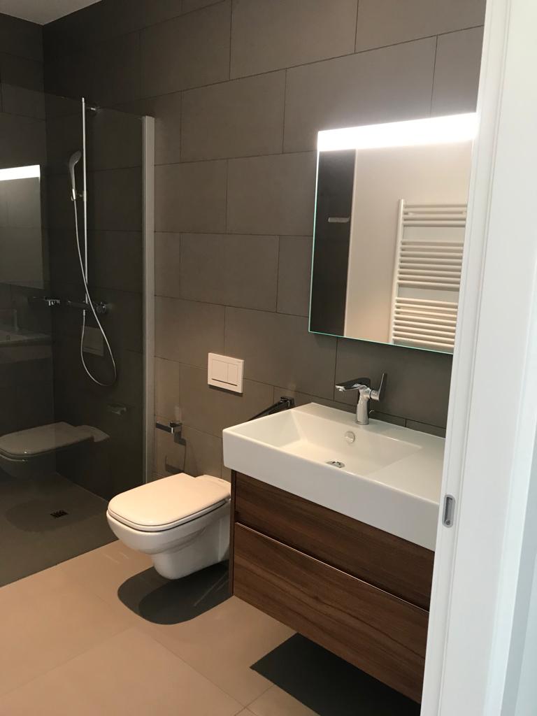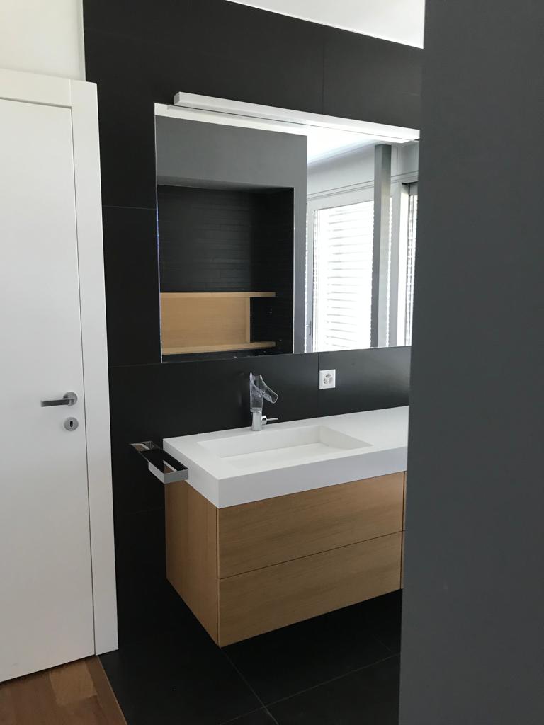 Après avoir vu les extérieurs et les cuisines de notre immeuble à Lamone TI, continuons avec les salles de bains.