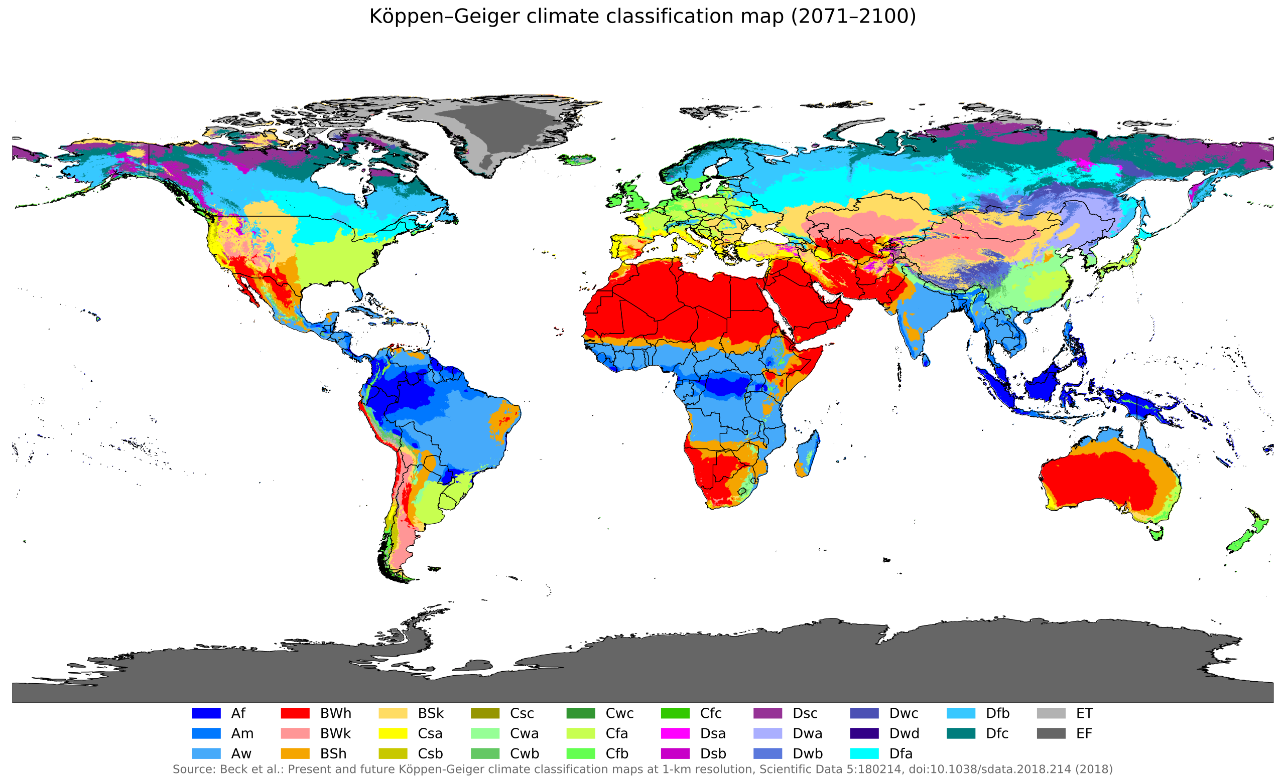 - B: Climat désertique. Dans le désert, le climat est très sec et les pluies sont rares. Il peut y avoir deux types de déserts: les déserts chauds (BWh), en Afrique, Moyen Orient et Australie, et les déserts froids (BWk), en Asie centrale. Des déserts de plus petite taille se trouvent également en Amérique du Nord et du Sud.