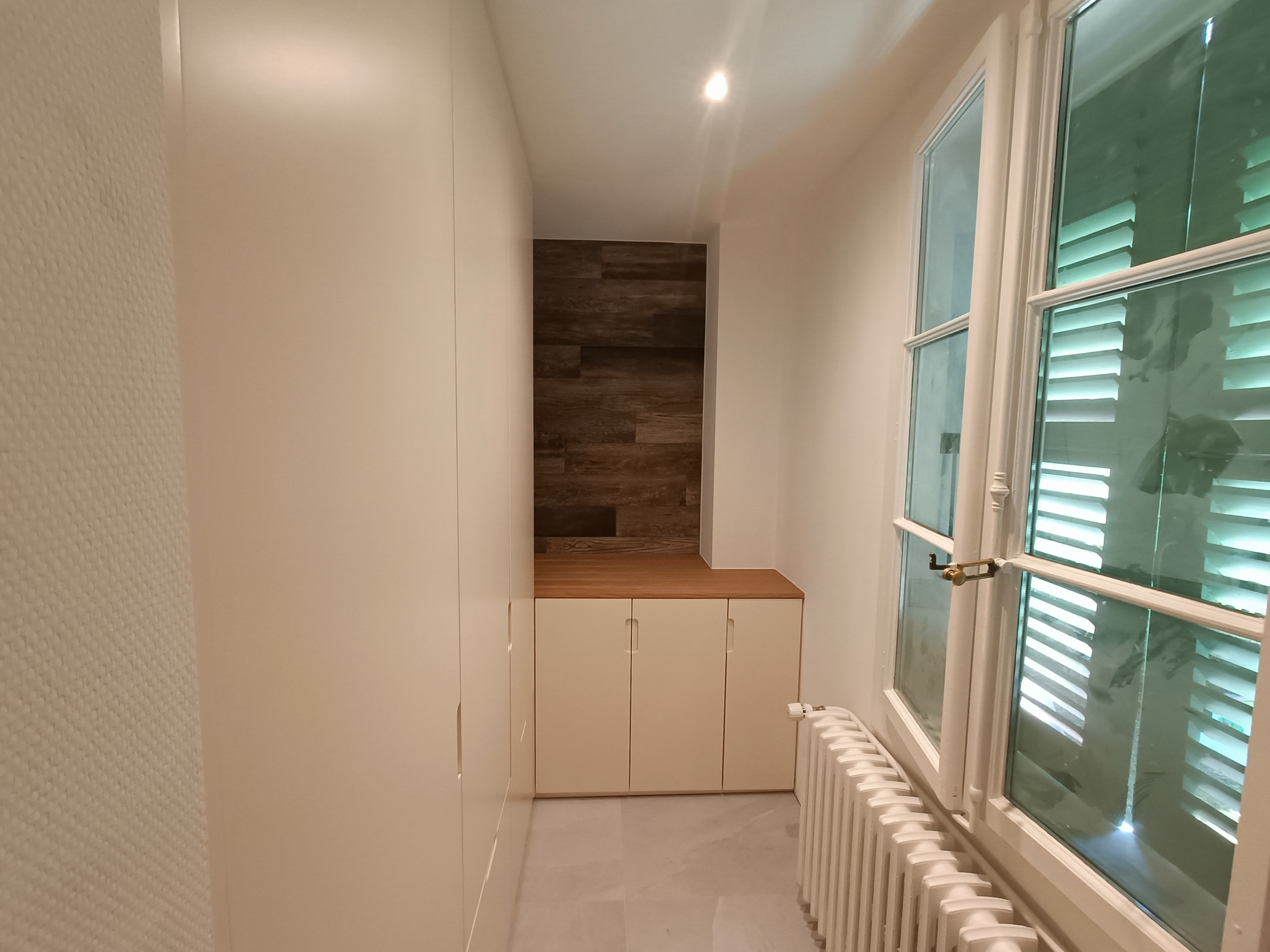 Les chambres ont été optimisées grâce à la pose d’armoires intégrées, offrant ainsi des solutions de rangement élégantes et pratiques tout en s’intégrant harmonieusement à l’esthétique des pièces. Conçues sur mesure, ces armoires maximisent l’espace disponible et apportent une touche de modernité et de raffinement.